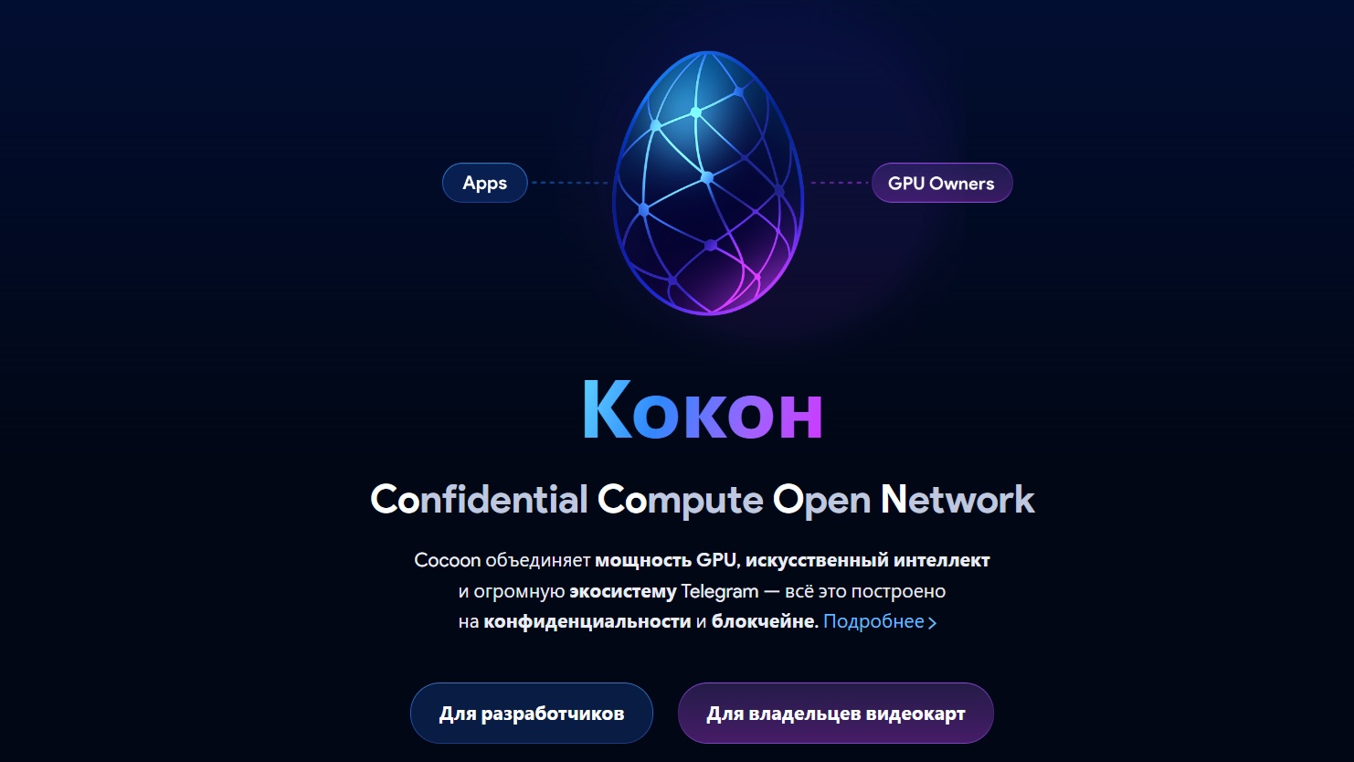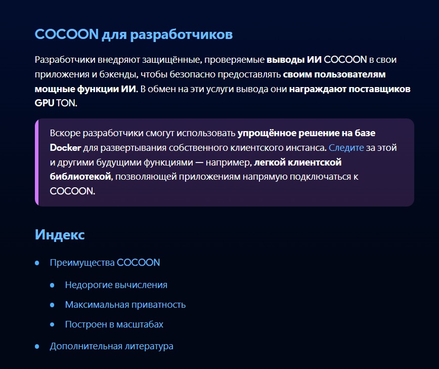 Официальный сайт проекта, cocoon.org, выполнен в лаконичном, технологичном стиле. Функционал Cocoon информационный — он кратко объясняет суть Confidential Compute Open Network, определяет целевую аудиторию и служит точкой входа для получения подробностей.