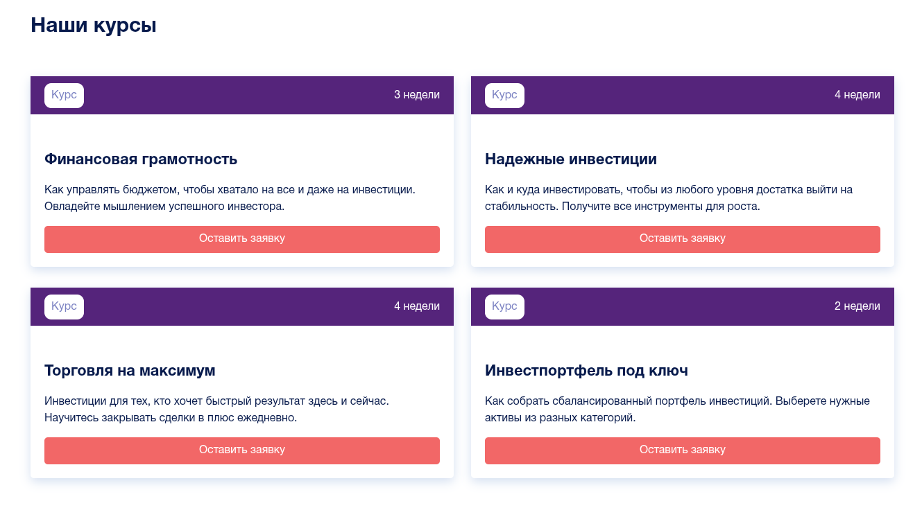 Каталог курсов – это линейка из четырех ступеней со стандартными обещаниями в духе «быстрый результат здесь и сейчас» и «ежедневные сделки в плюс». Длительность обучения составляет от 2 до 4 недель, но вот цен почему-то нигде нет. После подачи заявки клиенту должен позвонить менеджер и лично все рассказать. Такой подход уже намекает на агрессивные продажи по телефону – типичная практика псевдо-академий при серых брокерах.