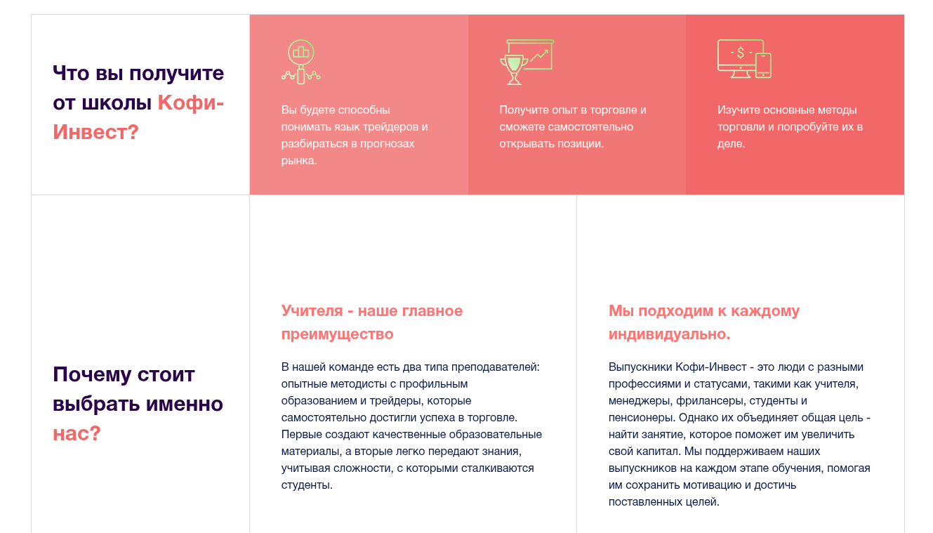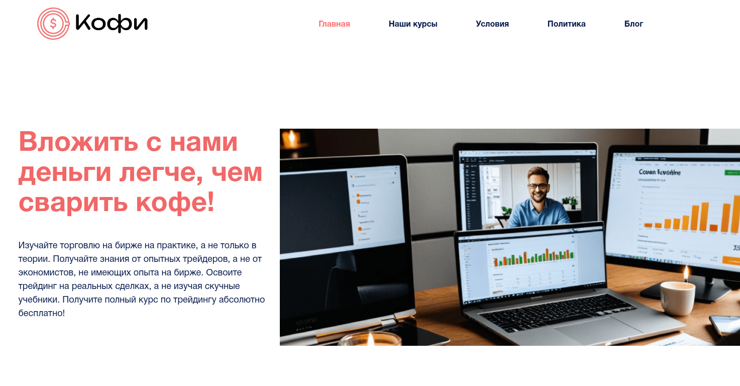 Работает «Кофи Инвест» по простой воронке – новичков заманивают на лендинг, где давят на «практику вместо теории», «преподавателей-трейдеров» и сулят быстрые результаты. Отдельным блоком красуются «Отзывы о нас», там расписаны истории успеха уже через пару недель учебы. Маркетинговые слоганы про «реальные сделки» подводят к тому, что обучение плавно перетекает в торговлю через их же платформу.