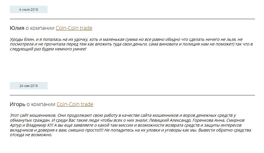 Отзывы о «Коин Коин Трейд» носят крайне негативный характер. Клиенты рассказывают, что сначала брокер помогает открывать позиции. После того как трейдера затягивает, его вынуждают поднимать депозит под предлогом отработки бонусов или докапитализации. Многие говорят, что депозиты нарочно сливают.