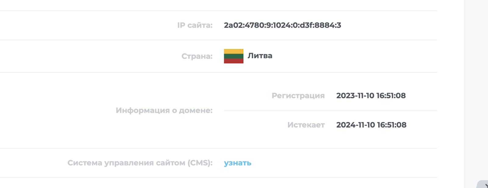 Однако проверка показывает, что базовый домен сайта был зарегистрирован в ноябре 2023 года. Этот факт сразу вызывает негативное впечатление о достоверности данных от разработчиков.