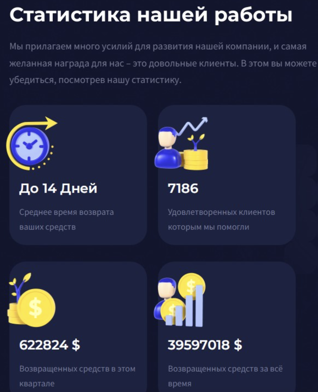 На сайте Coin Track Solutions указаны несколько ключевых преимуществ. Во-первых, компания утверждает, что возвращает деньги в среднем за 14 дней, что нереально для подобного юридического процесса. Во-вторых, команда активно демонстрируют положительную статистику своей работы: от 7 тысяч довольных клиентов до успешных сделок по возврату денег на огромные суммы.