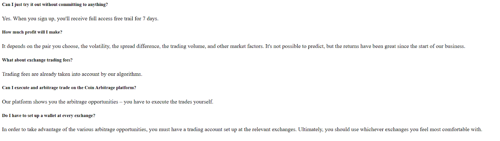 Coin Arbitrage на сайте в правилах сообщает, что проект имеет бесплатный пробный период в 7 дней, чтобы клиент мог оценить обменник. Пишут, что комиссии заранее включены в алгоритм, но не сообщает о том, какие именно проценты берут авторы и есть ли какие-то доплаты за вывод средств или другие дополнительные услуги.