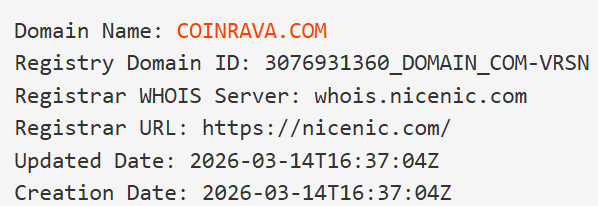 Домен сайта Coinrava зарегистрирован в марте 2026 года. У проекта нет никакой репутации и стажа работы, что делает контору весьма подозрительной.