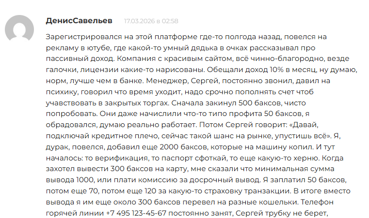 Один из пользователей в своем отзыве о Coinrava пишет, что закинул на эту платформу $2,5 тыс., но не смог ничего вывести. Мошенники сначала требовали вносить новые платежи, а затем заблокировали аккаунт.