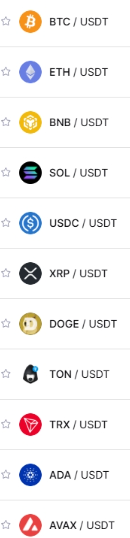 После регистрации трейдер получает доступ к торговле несколькими десятками криптовалют. Среди них — BTC, ETH, BNB, XRP и DOGE. Большой ассортимент можно считать плюсом этой биржи.