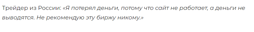 В негативных отзывах вкладчики не рекомендуют фейковую биржу для вложений. По словам пользователей, их аккаунты подверглись блокировке. Проект не предоставляет никаких гарантий и безопасности вкладов.
