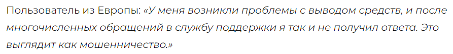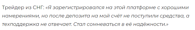 Положительные отзывы на сторонних ресурсах отсутствуют. Люди жалуются, что деньги, после пополнения счета через платежную карту, не поступают на баланс кошелька. Пользователи сомневаются в том, что это надежный брокер, которому можно доверять.