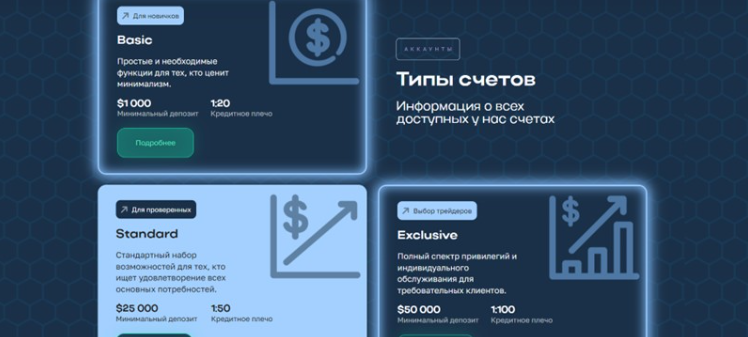 • Exclusive. Пополнить кошелек нужно на сумму от 50 000 долларов, кредитное плечо — 1:100.
