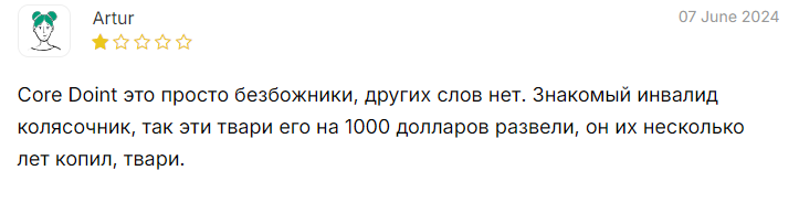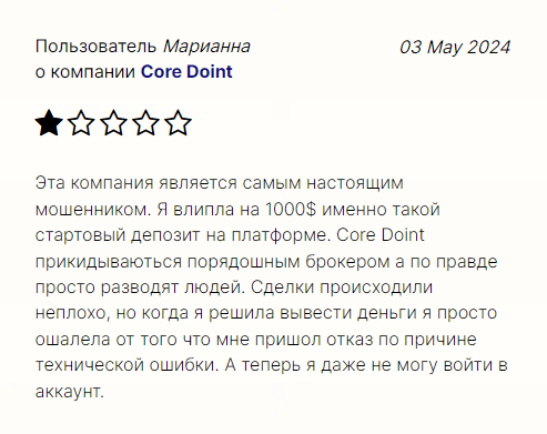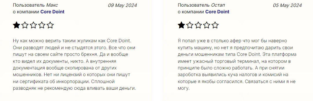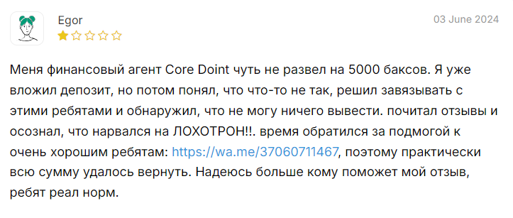 • Негативные отзывы о Core Doint. Пользователи заявляют об отказе в выводе денег, давлении, угрозах. Недовольство сервисом платформы со стороны реальных клиентов подтверждает, что высок риск оказаться в убытке.
