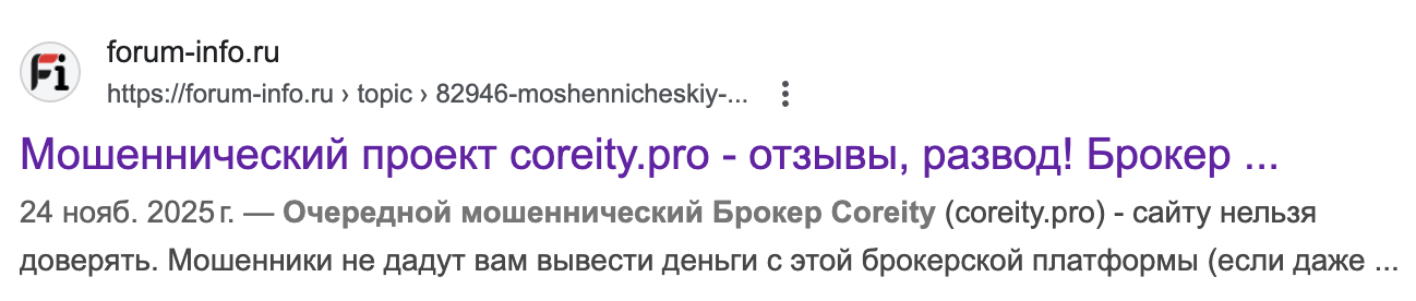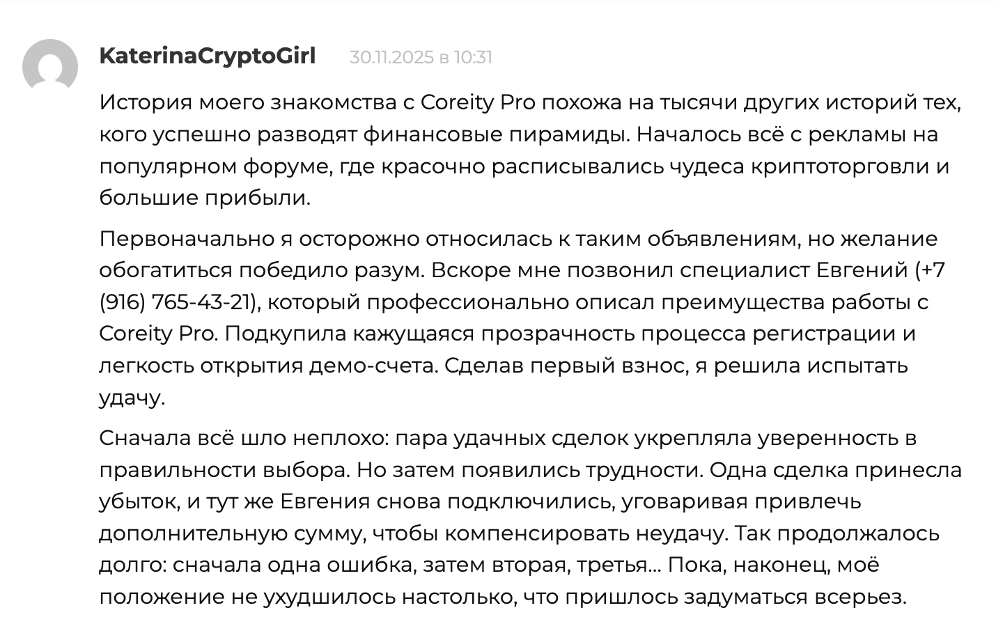Репутация у проекта складывается в довольно тревожную картину. Есть множество негативных отзывов о Coreity. Пользователи описывают ситуации, которые характерны для проектов с агрессивным маркетингом и навязчивыми менеджерами. Есть жалобы на потери депозитов, агрессивный апселл и отсутствие ответа на претензии. При этом каких-то положительных комментариев в сети нет.