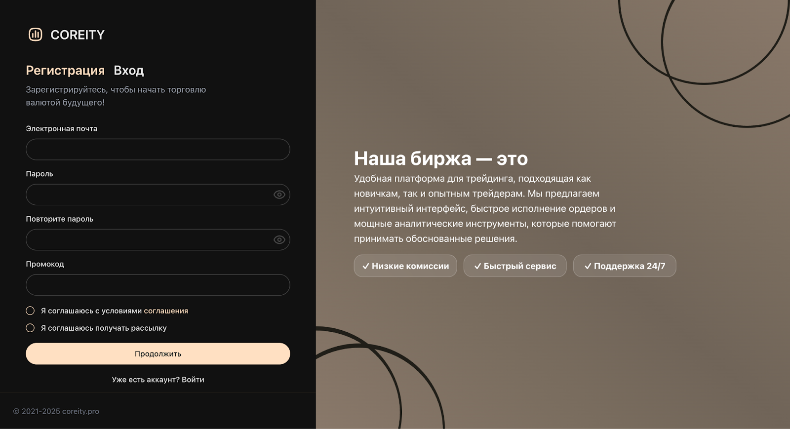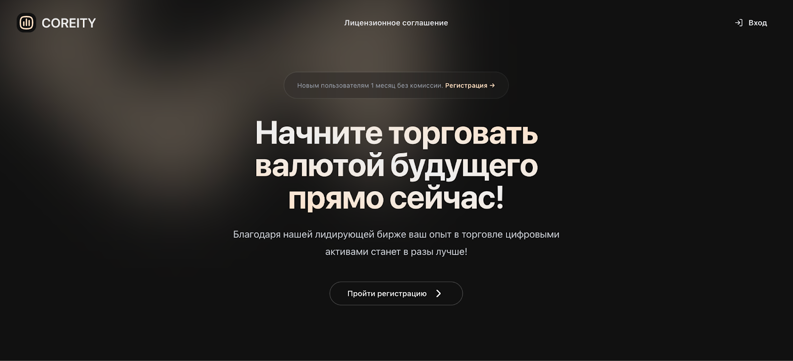 Coreity Pro — торговая платформа для работы с крипто и цифровыми активами. Проект позиционирует себя как лидирующая биржа с акцентом на простоту входа и высокий доход за счет собственных торговых стратегий и сигналов. На главной странице проекта представлены маркетинговые тексты с обещаниями торговать валютой будущего, быстрой регистрацией и поддержкой. Далее узнаем, соответствуют ли данные заявления реальности или нет.