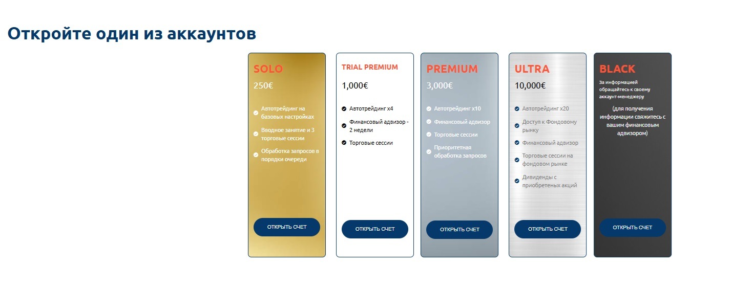 • Solo. Минимальный депозит ценой в 250 евро. Также включает в себя вводное занятие, но обработка запросов идет в порядке очереди.