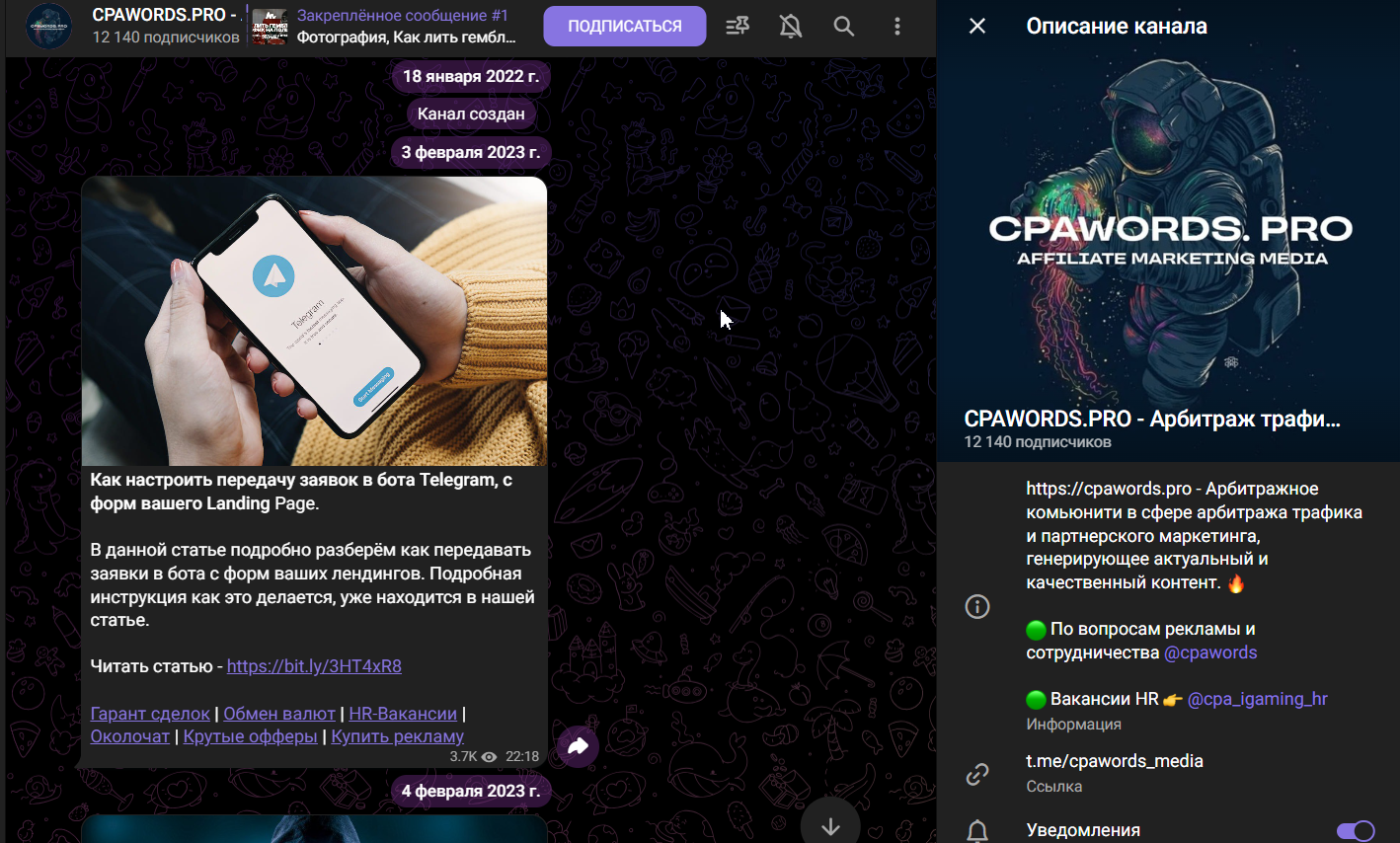 CpaWords – это комьюнити в сфере арбитража трафика и партнёрского маркетинга, генерирующее актуальный и качественный контент. У проекта даже открыта вакансии HR – вопросы уточняются через профиль cpa_igaming_hr. В обзоре проанализируем публикуемый контент, дату регистрации проекта, активность подписчиков, перспективы и риски сотрудничества.