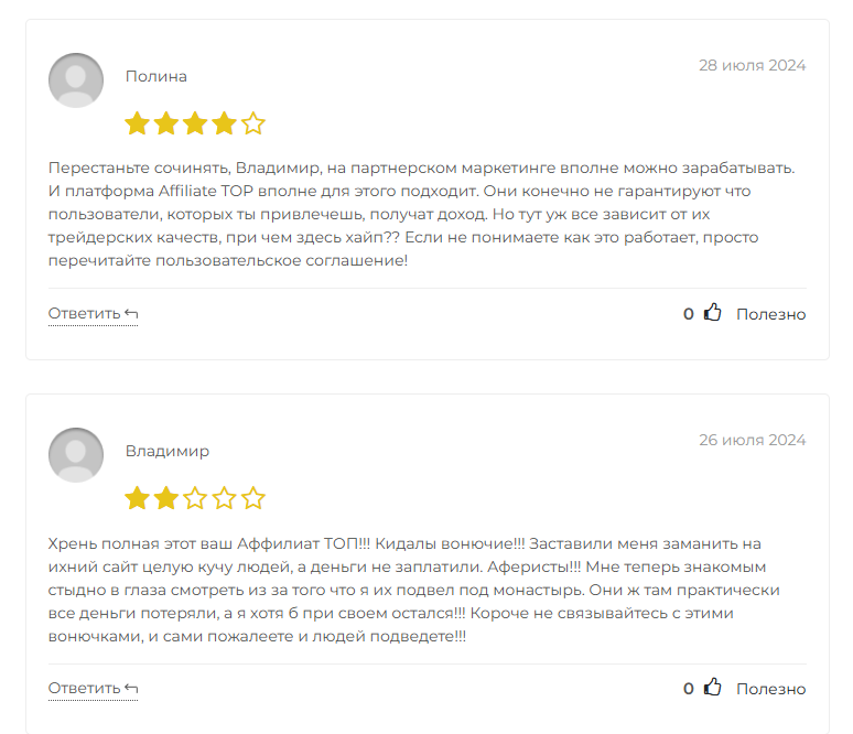 Мы выбрали случайную статью и проверили репутацию одного из сервисов, которые рекомендуются на сайте. Выяснилось, что Affiliate TOP – обычный хайп-проект, который предлагает зарабатывать на партнёрском маркетинге в сфере трейдинга. У проекта много негативных комментариев, а это прямые финансовые риски. Можно предположить, что админ CpaWords_Media либо не проверяет проекты на честность, либо CpaWords намеренно сотрудничает с мошенническими проектами и получает деньги за их продвижение.