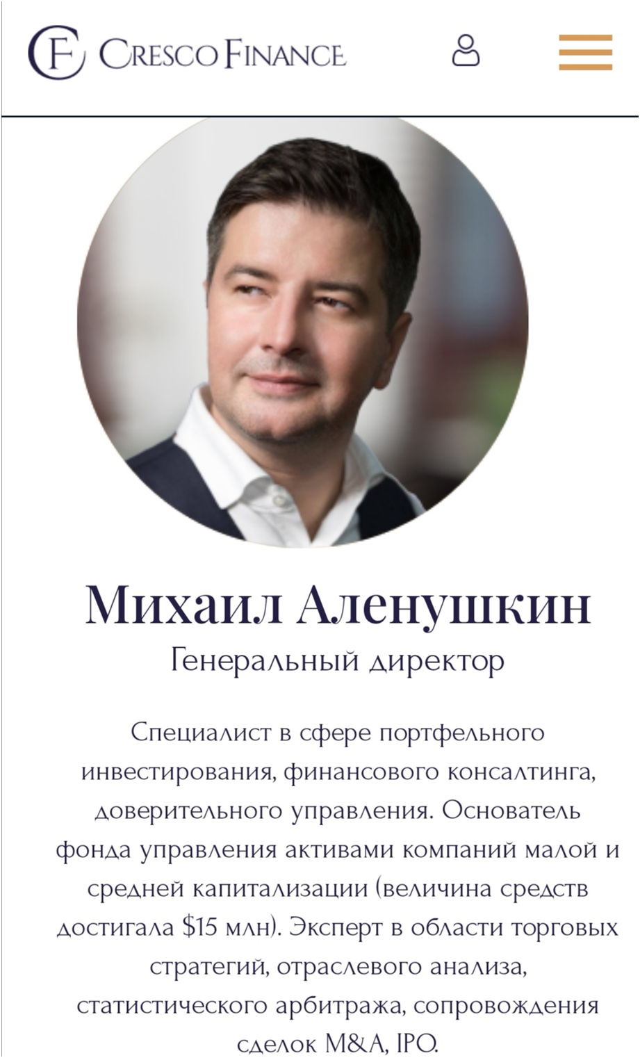 Сотрудников не так уж и много, их биография не раскрывается. Информация – сжатая, и свидетельств тому, что это настоящие люди, нигде нет. Возможно, они фейковые. Еще странно, что создатель Cresco Finance Татьяна Кулибабина на сайте не представлена.