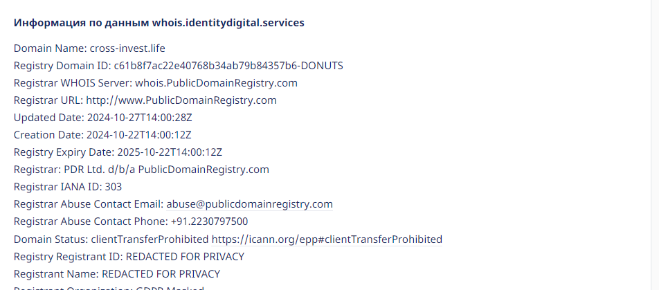 На ресурсе указано, что компания Cross Invest Life существует на рынке трейдинга и инвестиций более 8 лет. Однако, проверив сервисы по пробиву домена, можно узнать, что сайт существует с октября 2024 года.