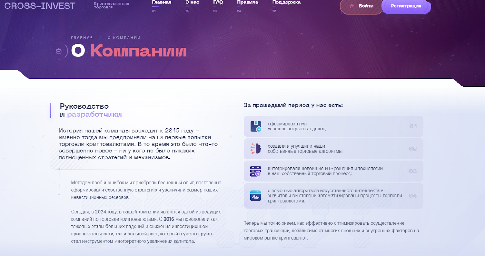 Сам брокер был создан недавно, а именно в октябре 2024. Поэтому мы не рекомендуем сотрудничать с Cross Invest, ведь есть риск быть заскамленым или просто получить блокировку и потерять свои деньги.