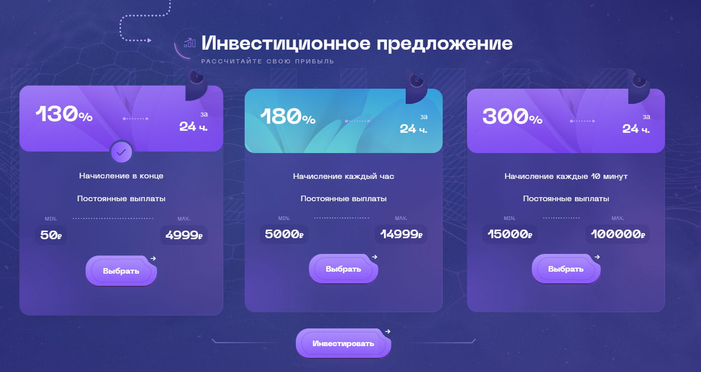 - Обычный, со 130% прибыльностью за сутки. Минимальный депозит от 50 рублей до 5000 руб.