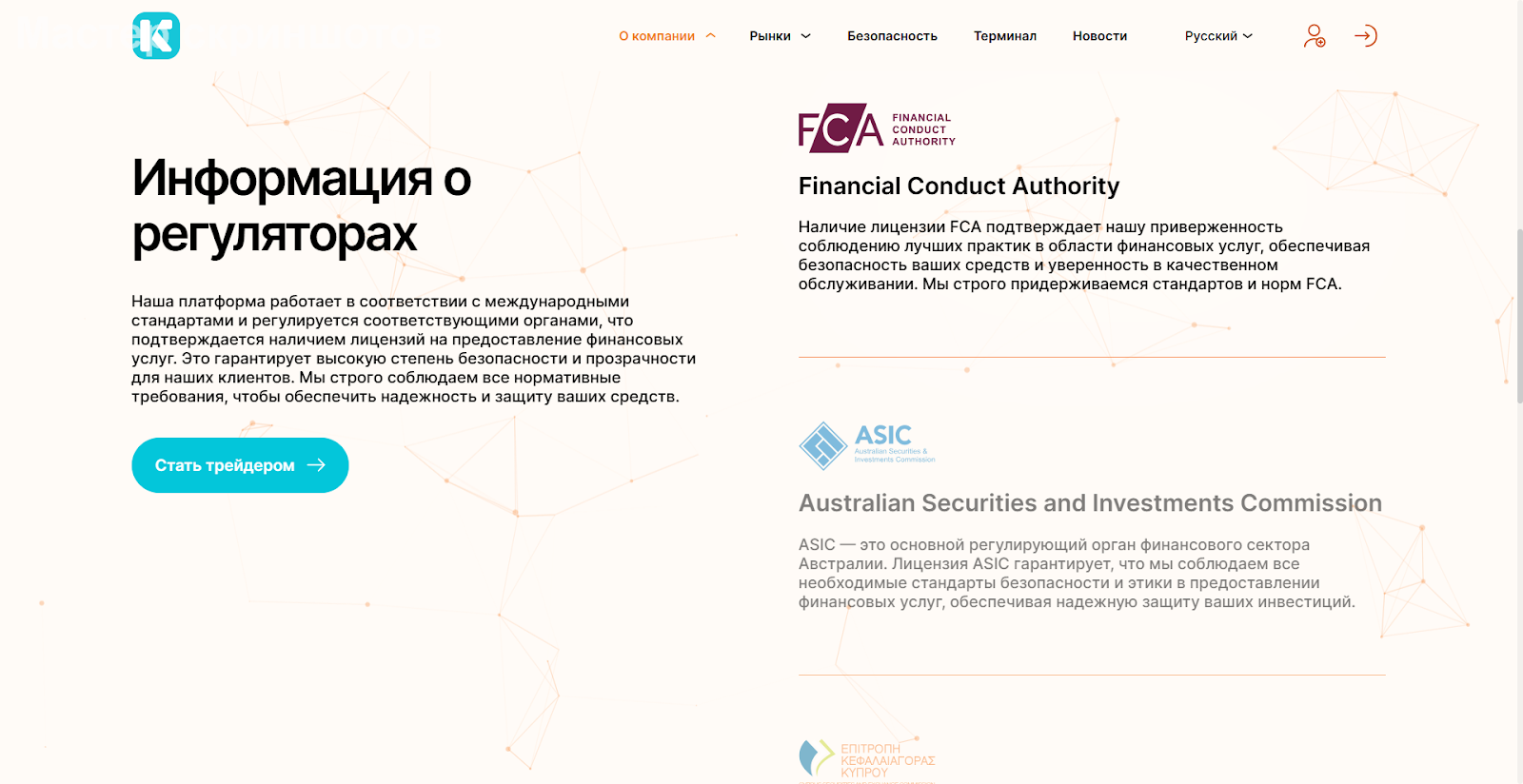 Если говорить о брокере, он вроде подтверждает, что у него есть регистрация. Он утверждает, что деятельность регулируется DFSA, FCA, CySEC и ASIC. Но при этом дает ссылки не на реальные сайты финансовых регуляторов с лицензиями, а на фейковые страницы, только внешне на них похожие. Это явный обман. Компания, видимо, занимается мошенничеством, а не трейдингом.