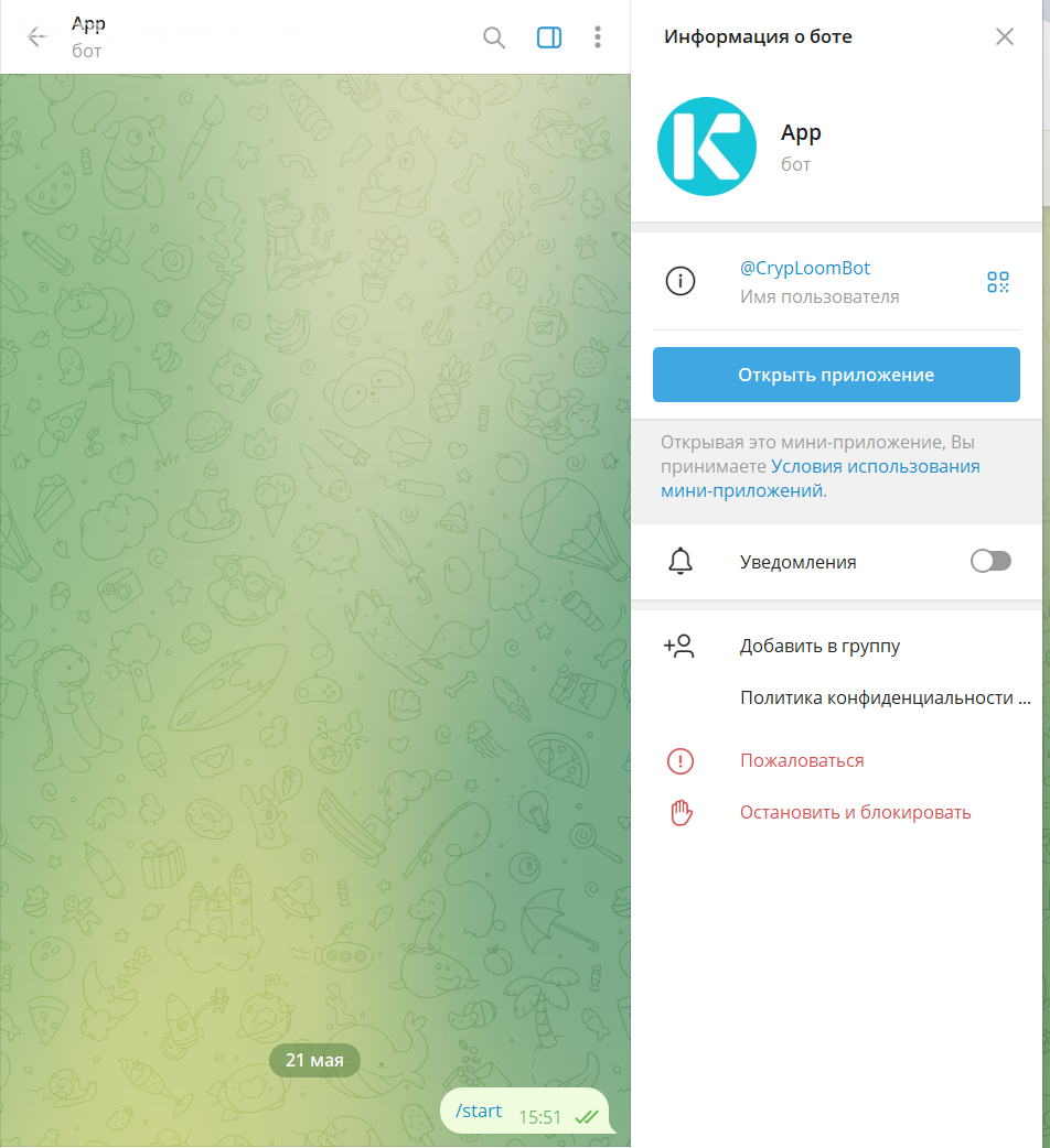 Сам бот выглядит достаточно просто. Меню служит только для того, чтобы перейти в приложение.
