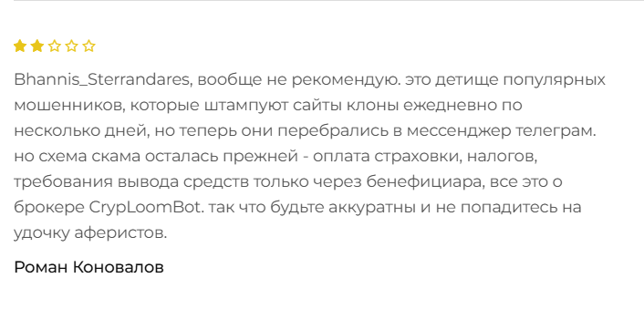 Брокер CrypLoomBot не вызвал у нас доверия. Ресурс явно принадлежит аферистам, не стоит с ним связываться. Если вы уже пользовались услугами команды, оставляйте свой комментарий. А если хотите больше узнать о способах заработка в сети, читайте другие наши статьи.