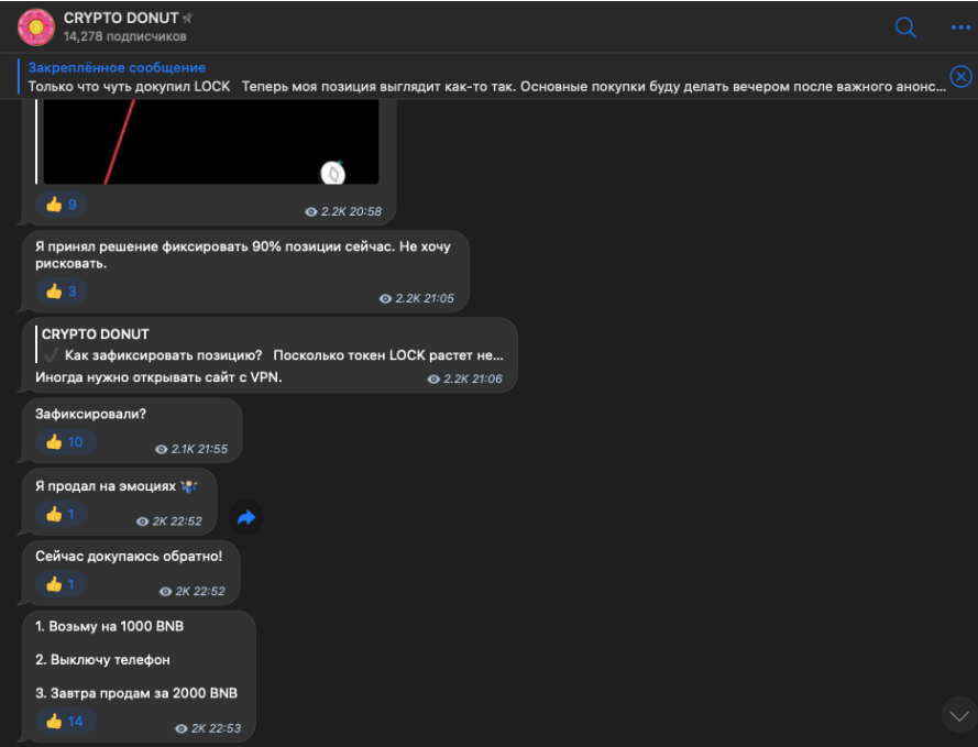 В телеграмм-канале не продавались курсы. Разработчики проекта не просили скинуть им деньги для стартапа. Сотрудники организации публиковали новости о криптомонетах, которые должны были появиться на рынке и в биржах. У некоторых криптовалют не было листинга, но администратор Crypto Donut публиковал о них новости.