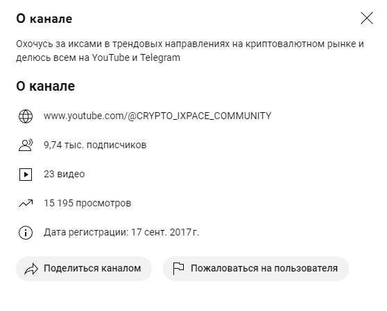 При такой крупной аудитории на канале всего 23 видео, положение их которых было опубликовано 2 года назад. Дата создания канала 17 сентября 2017 года, что говорит о том, что он был куплен под данную школу, так как «Икспейс» появился только в 2021. У всех роликов в среднем просмотров не более 500, что говорит об использовании накрутки подписчиков ботами.