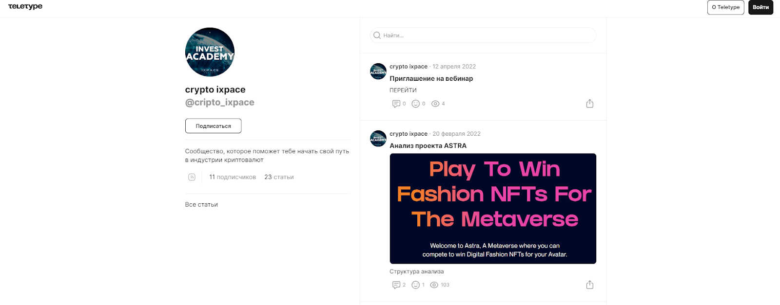 На блогерской площадке Teletype за проектом следят всего 11 человек. Контент состоит из анонсов мероприятий, которые будут проходить.