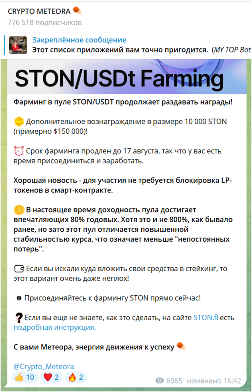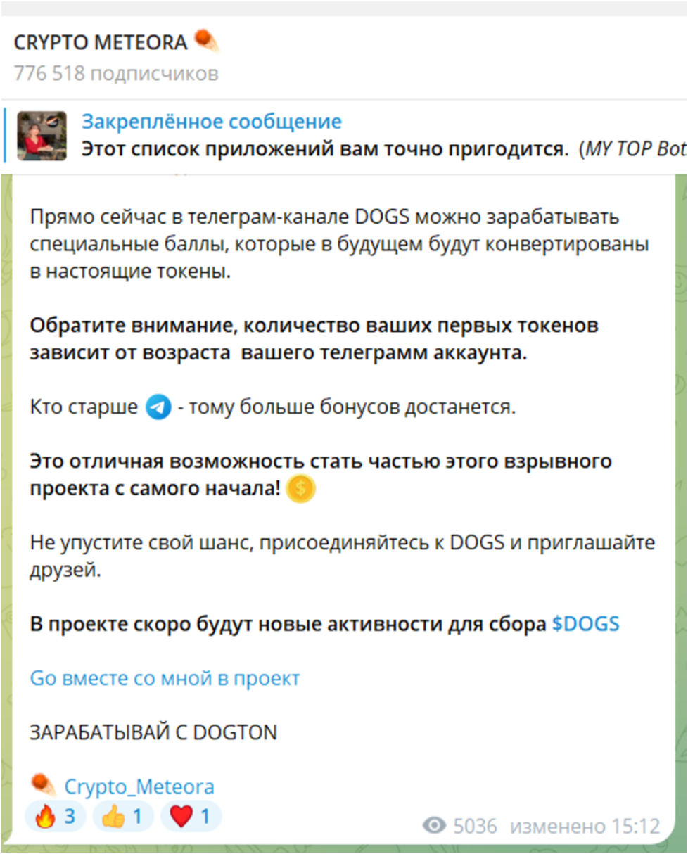Информационный ресурс «Крипто Метеора» был создан недавно – 17 июля 2024 года. Благодаря частой публикации достоверной информации о крипто проектах, канал приобрел популярность среди пользователей Telegram. На 03.08.24 на него подписано более 776 000 пользователей. Каждый день посты смотрят от 7500 до 9000 человек, есть много лайков и комментариев.
