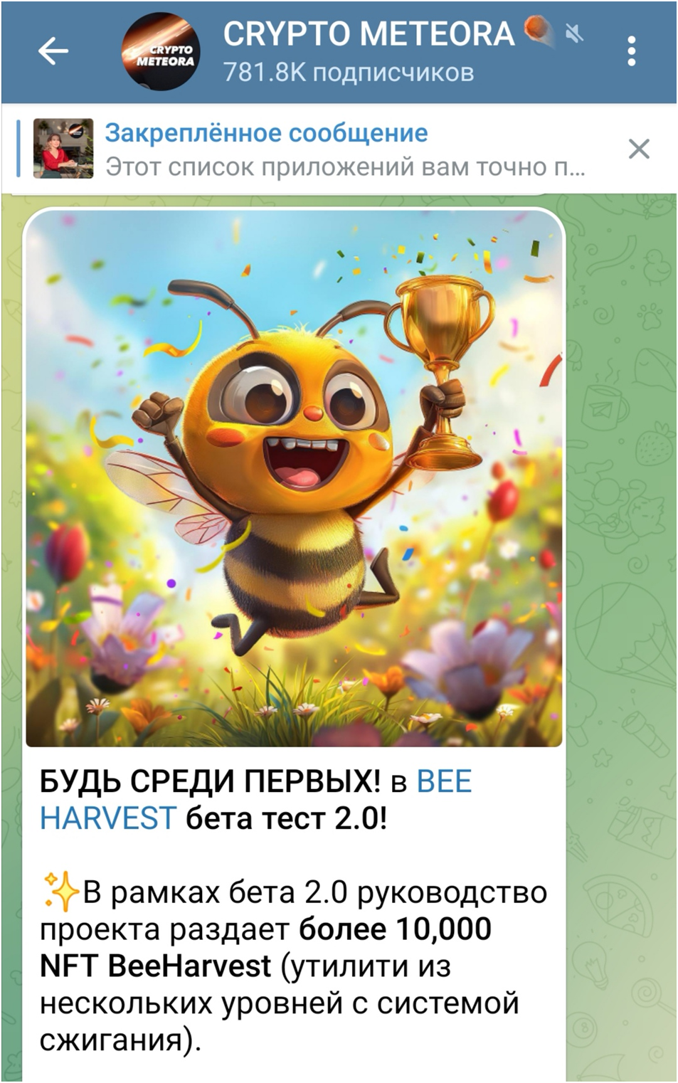 В паблике можно узнать информацию, которая позволит фолловерам зарабатывать больше денег на ботах-тапалках. Именно здесь публикуются все самые актуальные новости из мира криптовалют. Пролистав канал, мы увидели, что недавно автор сообщил в ленте о запуске бета-2.0 проекта Beet Harvest, который предоставляет клиентам возможность регулярно получать прибыль.