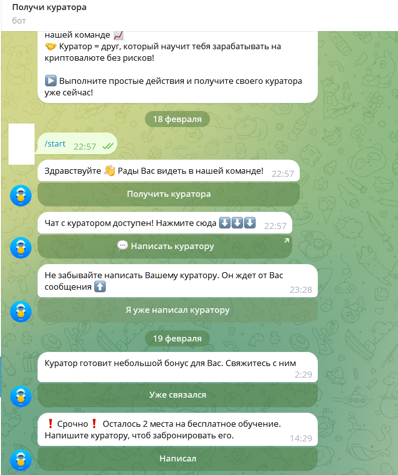 Для связи с куратором бот предлагает написать неизвестному Марку, который начнет обучение. Никаких действий по торговле криптовалютой программа Crypto Partners Bot, которая еще называется «Получи куратора» не выполняет.