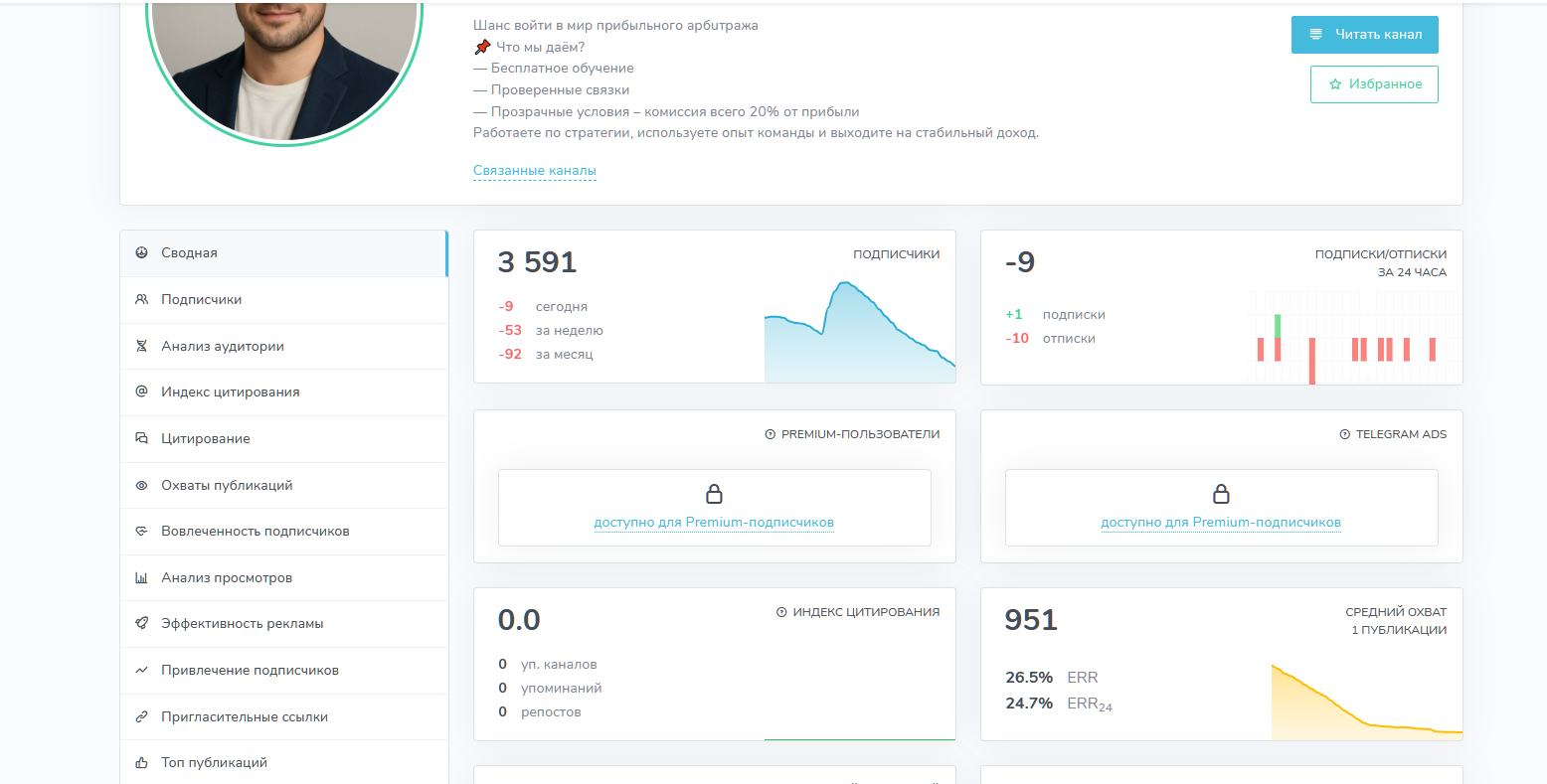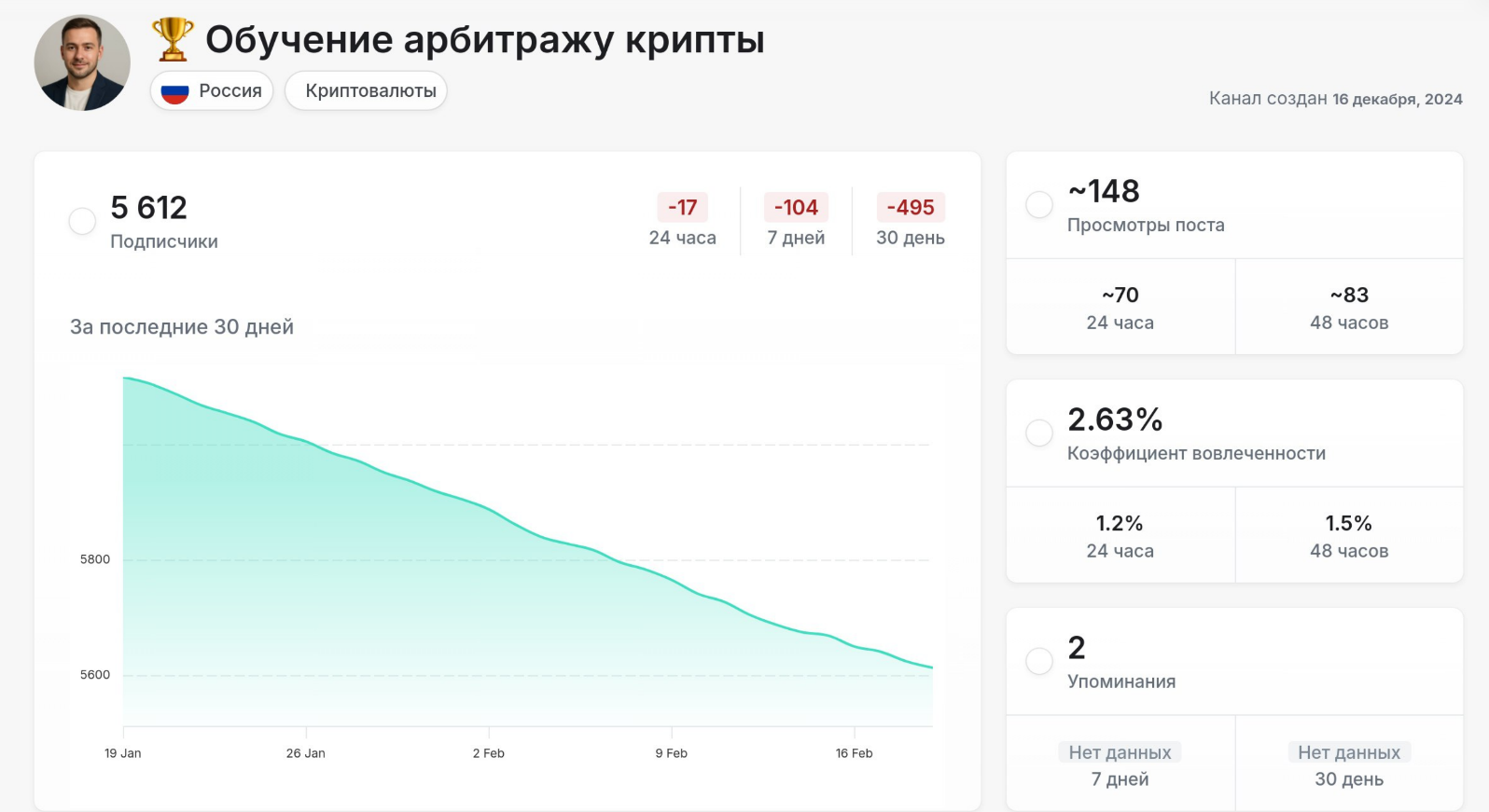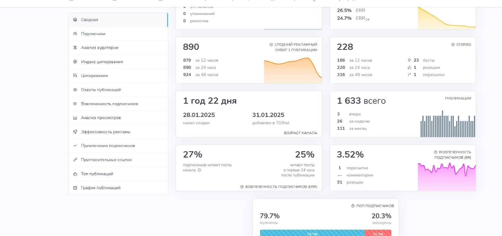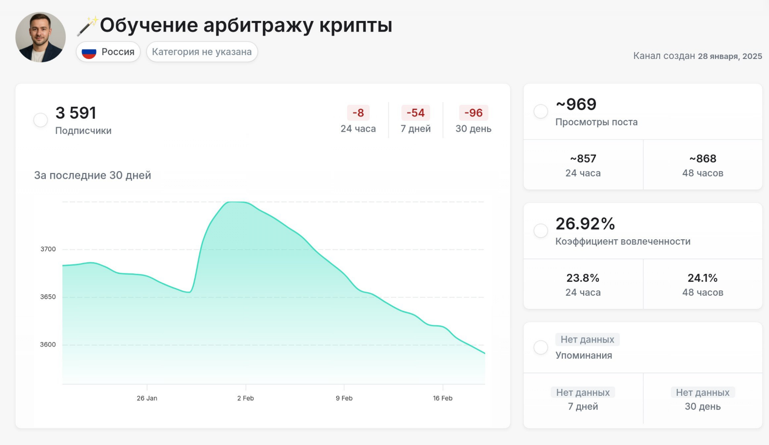 Накрутку трафика на канале подтверждает статистика Telegram. Читают посты всего 25% аудитории, вовлеченность пользователей низкая. За месяц от проекта отписалось 92 человека.