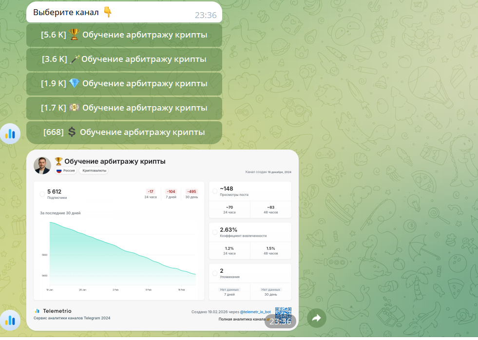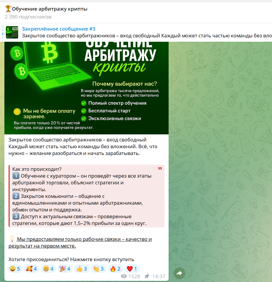 Реклама бота активно продвигается в одном ТГ канале learnarb crypto, который принадлежит неизвестным разработчикам приложения для обучения арбитражу.