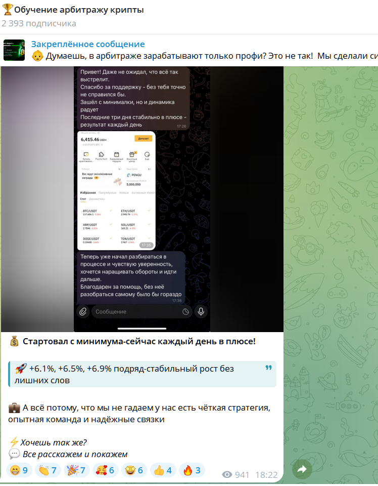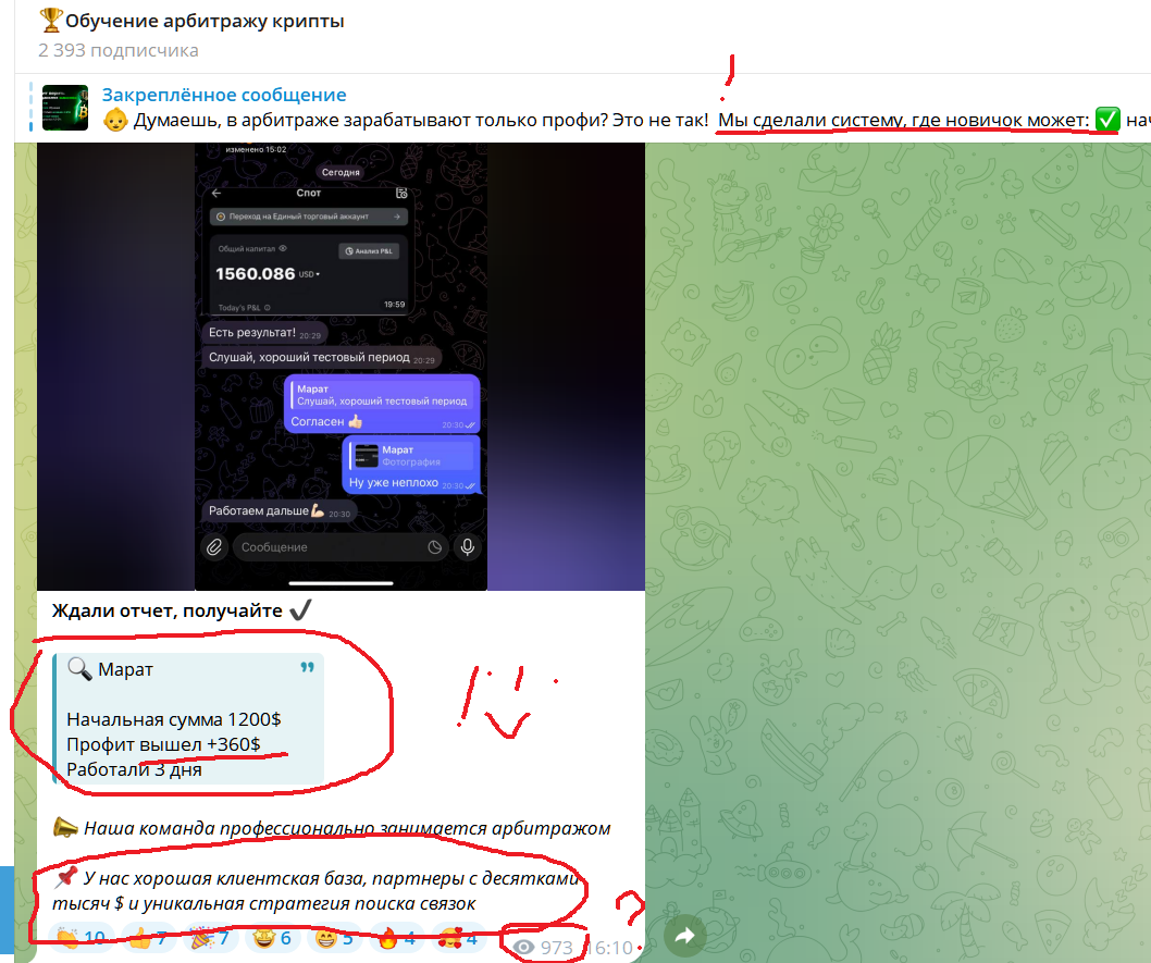 Мошенники в скам каналах используют стандартный набор маркетинговых уловок, но на них все равно покупаются новички и даже опытные трейдеры:- Оказывается, разработана система, по которой даже новичок сможет зарабатывать стабильный доход и быть всегда в плюсе на арбитраже.