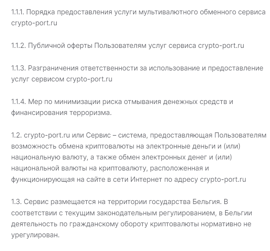 Сотрудники обменника «Крипто Порт» заявляют, что работают 24 часа в сутки 7 дней в неделю. Юридический адрес компании находится в Бельгии. Они представляют все эти данные в правилах обмена. Простота исполнения страницы с уставом компании вызывает подозрения и омрачает положительное впечатление, создавшееся от терминала.