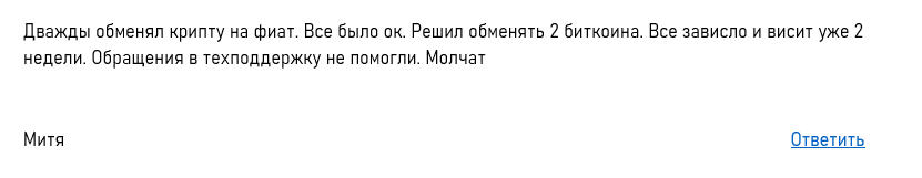 Если изучать независимые ресурсы, то можно найти отрицательные отзывы. В комментариях с негативным оттенком люди пишут, что владельцы обменника сами названивают людям и просят их обменивать криптовалюту. Им начинают звонить сразу после регистрации пользователей. Также многие люди пишут, что потеряли деньги в этом обменнике. А служба поддержки вообще молчит.