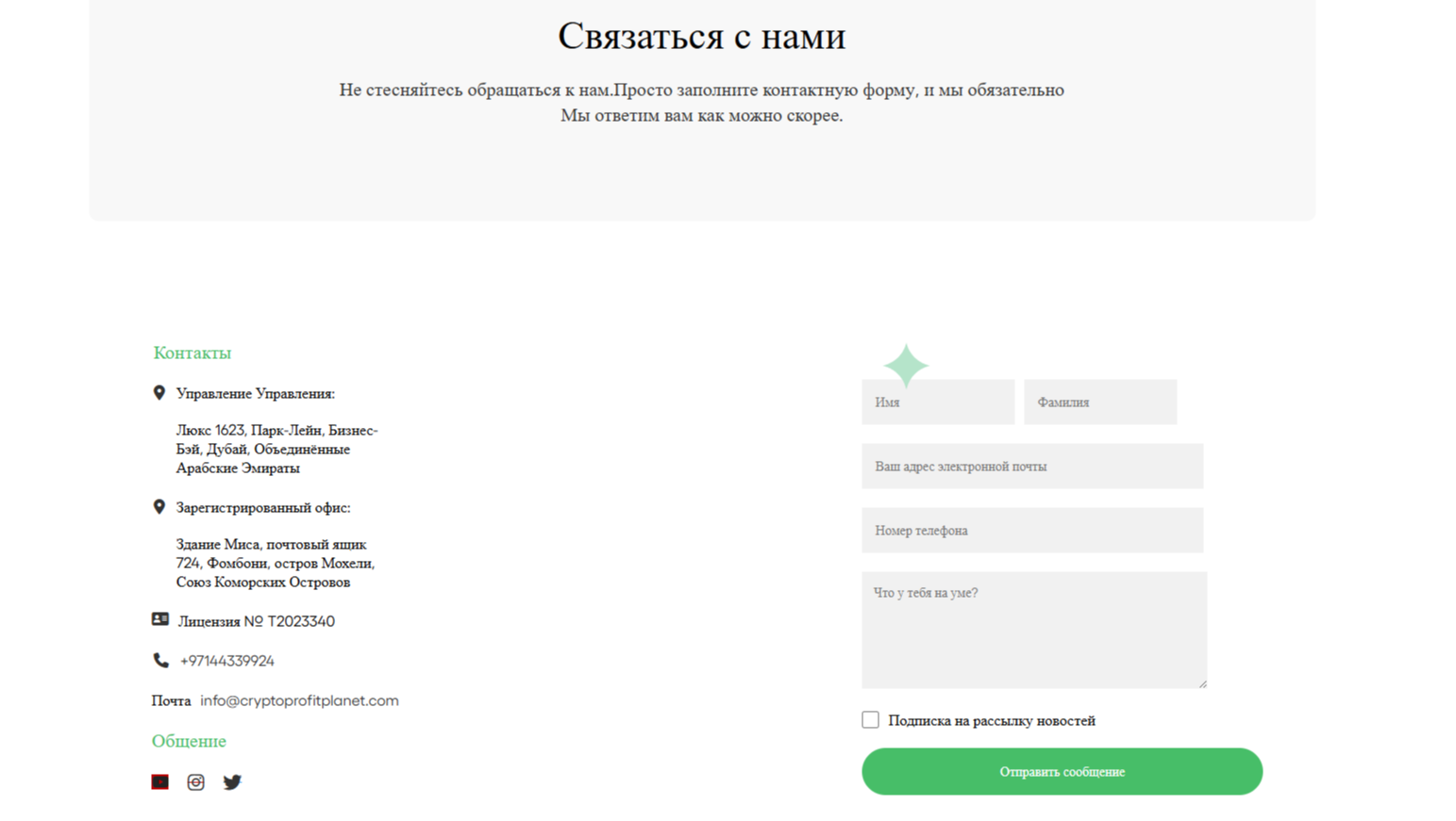 Брокерская организация Crypto Profit Planet предлагает своим клиентам квалифицированную службу поддержки. Однако время работы ее неизвестно. Для связи с техподдержкой следует использовать номер телефона +97144339924 или имейл support cryptoprofitplanet com.