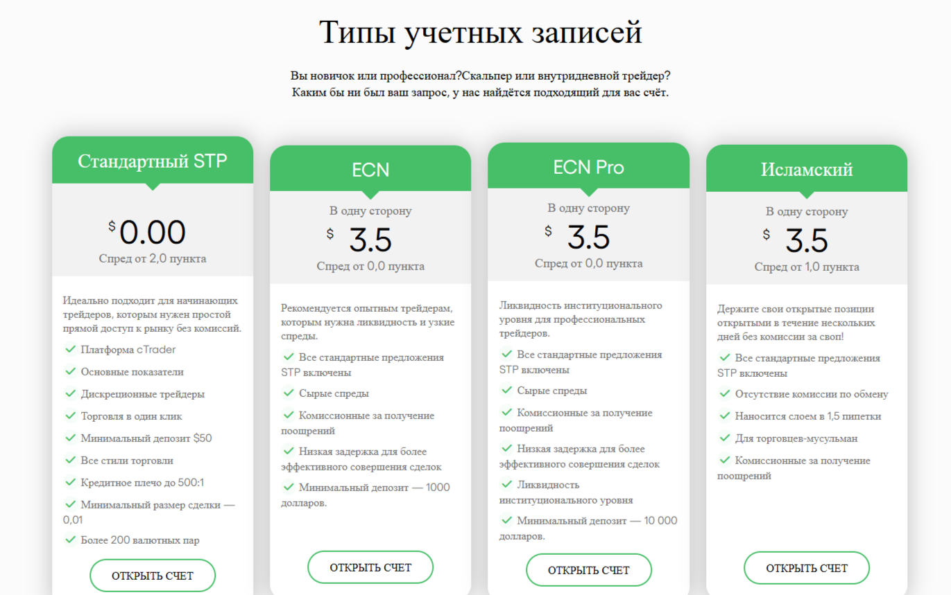 - «Стандартный STP». Депозит от 50 USD, леверидж до 1:500, минимальная сделка 0,01, 200+ валютных пар.