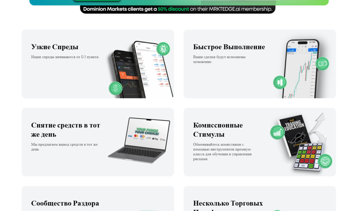 Портал сомнительного посредника удивительно похож на ресурс dominionmarkets com, замеченный в мошенничестве и разводе. Идентичные тарифы, отзывы клиентов, преимущества, лицензия № T2023340. В шапке порталов размещены разделы «Дом», «Счета», «Стимулы», «Платформы», «IB/Партнеры», «Образование», «О нас».