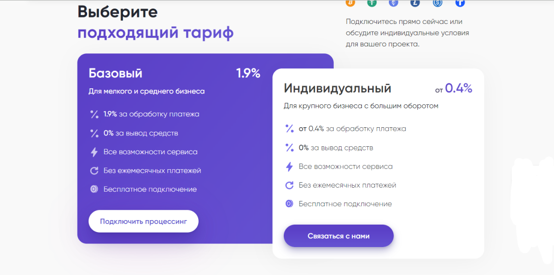 • Индивидуальный — от 0.4% комиссии. Снятие денег бесплатное, доступны все услуги сервиса. Для крупного бизнеса