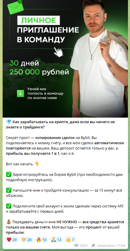 Потом Сергей стал публиковать коммерческие предложения: участие в закрытой группе трейдеров, копитрейдинг и пошаговое обучение для новичков. Подписчикам он предлагал быстрый доход до 250 000 рублей за первый месяц торговли.