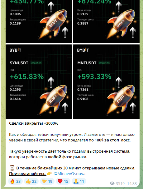 При этом, в ленте нет ссылок на верификацию сделок Sergey Minaev или ссылки на его инвестиционный портфель. Вместо прозрачных отчетов трейдер присылает скрины с биржи Bybit, но они только с плюсами – такой результат не может демонстрировать даже профессионал.