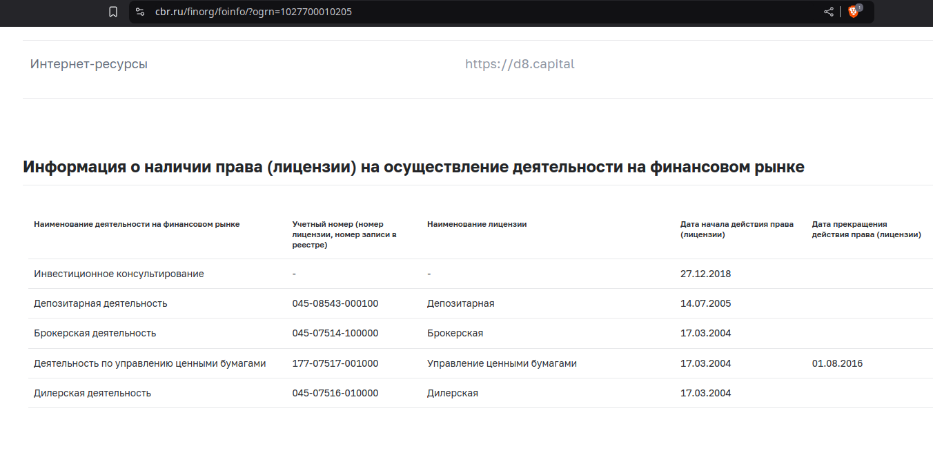 Сводная информация о брокере D8capital