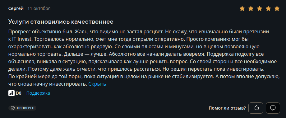 Работа сотрудников техподдержки Инвестиционного дома D8 по отзывам клиентов безупречна. Специалисты стремятся вникнуть в проблемы пользователей, предлагают оптимальные пути решения.