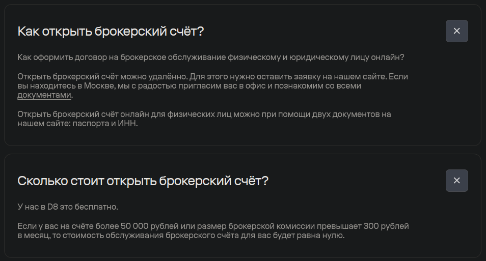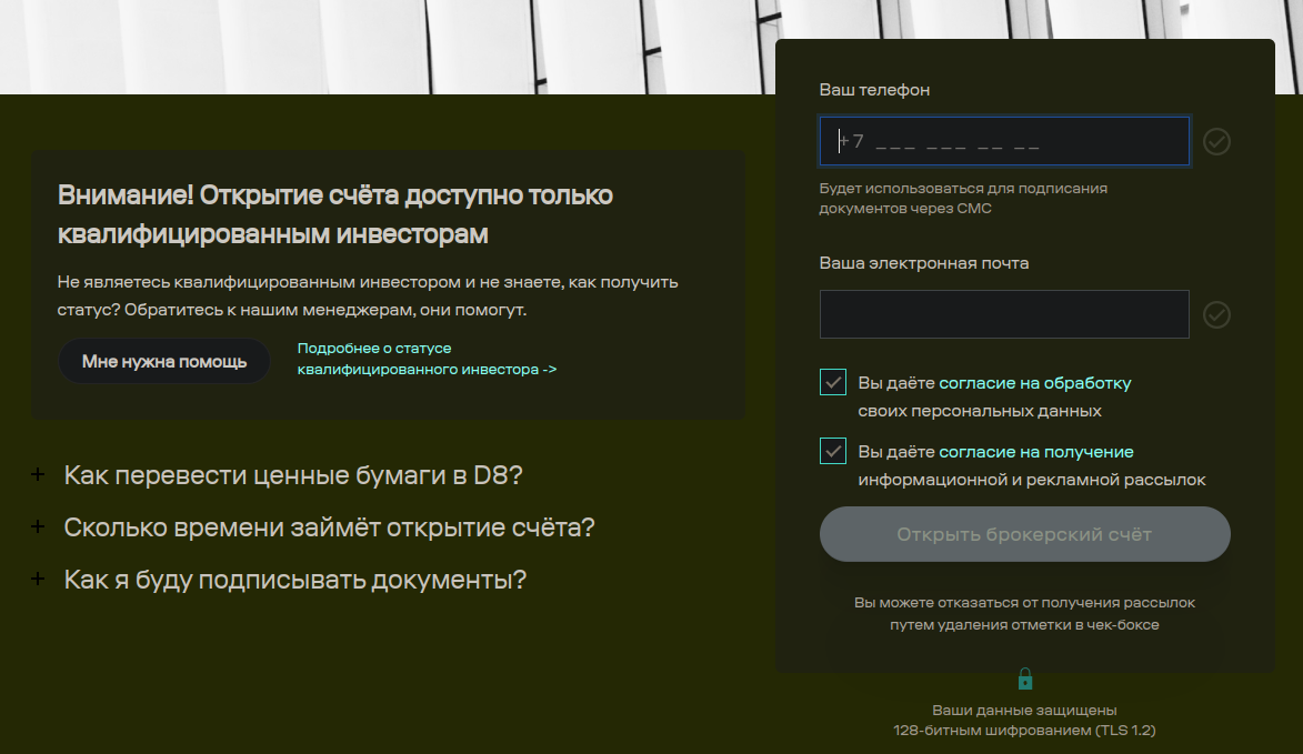 Чтобы стать клиентом «Д8 капитал» необходима регистрация аккаунта. Теоретически эта процедура доступна всем, однако фактически для открытия счета требуется быть квалифицированным инвестором. Для тех, кто не относится к подобной категории предлагают связаться со службой поддержки.