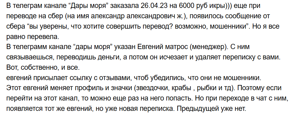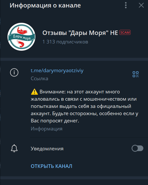 На канале, который отмечен надписью scam, представлены только положительные отзывы о проекте в Телеграмм «Дары моря», но выглядят они недостоверными, тем более, на сторонних источниках комментарии только отрицательные. Покупатели жалуются, что перевели деньги, но в итоге не получили ничего, а админ канала просто удаляет переписку, чтобы не оставлять следов.