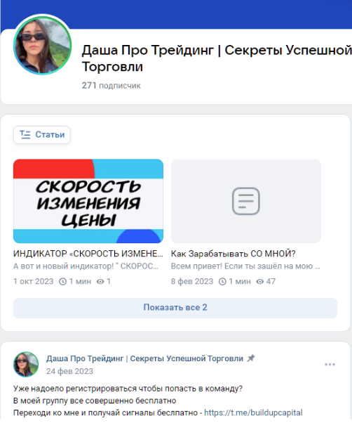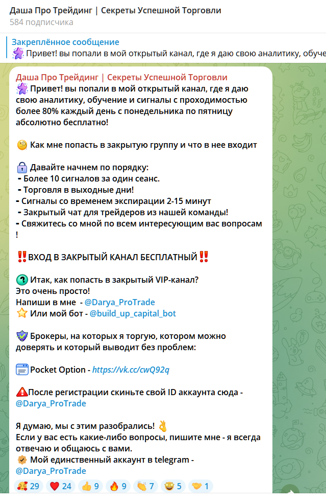 Канал “Даша Про Трейдинг | Секреты Успешной Торговли” занимается привлечением клиентов на эту площадку. Дальше работа мошенников идет по стандартной схеме – стимуляции к оплате выгодной сделки, призывы быстро пополнить депозит, а потом инвестиционный счет закрывается или сделка срывается.