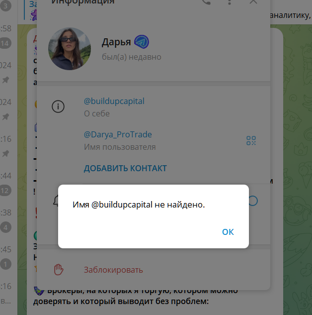 Данных о том, как и где училась торговать эксперт не сообщается. Полученная прибыль и финансовые успехи остаются тайной. Поддержка ведется в чате Телеграмма, но на момент написания статьи, адрес, указанный для связи buildupcapital не найден.
