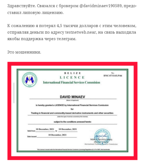 Судя по всему, Давид @ davidminaev190589 предлагал клиентам вкладывать деньги на финансовую площадку testnetweb.near. Пострадавший вложил туда 4 500$ и потерял все средства. Во время сотрудничества с ним на связь выходили менеджеры электронной службы поддержки через Телеграм.